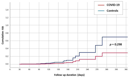 The cumulative risk of IBD recurrence in patients with COVID-19 versus controls (non-infected patients with IBD). IBD, inflammatory bowel disease; COVID-19, coronavirus disease 2019.
