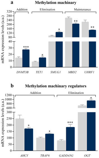 mRNA relative expression levels of altered genes involved in the DNA methylation process in ischaemic hearts versus controls. (a) Methylation machinery of DNA: genes related to addition (DNMT3B), elimination (TET1 and SMUG1) and maintenance (MBD2 and UHRF1) of methyl groups to DNA. (b) Methylation machinery regulators (AHCY, TRAF6, GADD45G and OGT). The results were obtained by mRNA-sequencing SOLiD 5500XL platform. Data are presented as the mean ± SEM. a.u., arbitrary units. Ischaemic cardiomyopathy patients (n = 13; blue), controls subjects (n = 10; grey). * p < 0.05, ** p < 0.01, *** p < 0.001.