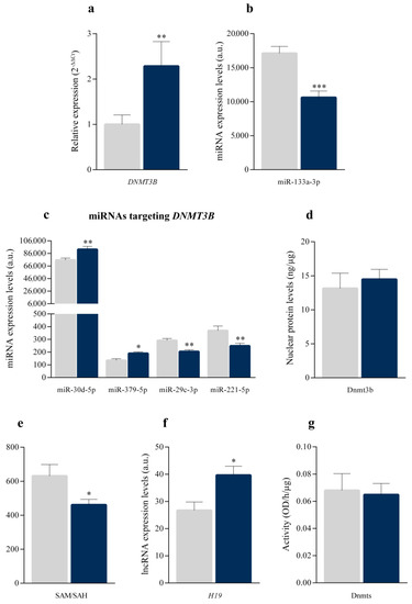 We validated the expression of DNMT3B, which plays a central role in the DNA methylation process and its overexpression contrasted with the general hypomethylation observed in these ICM patients. The results obtained by RT-qPCR corroborated the DNMT3B overexpression (2.22 fold and p < 0.01; Figure 2a) observed by RNA-seq (Figure 1a). We carried out a second RNA sequencing study, which allows the detection of ncRNAs and we observed alterations in several miRNAs previously described as regulators of DNMT3B expression. miR-133a-3p (Figure 2b), negative regulator of DNMT3B transcription, was reduced (−1.38 fold and p < 0.001). In addition, post-transcriptional regulators miRNAs of DNMT3B were altered (Figure 2c). Specifically, the miR-30d-5p (1.22 fold and p < 0.01) and miR-379-5p (1.41 fold and p < 0.05) were overexpressed, while the miR-29c-3p (−1.30 fold and p < 0.01) and miR-221-5p (−1.33 fold and p < 0.01) were underexpressed in ICM patients. Next, nuclear levels of the Dnmt3b protein were analyzed and we did not observe statistically significant changes between ICM and control individuals (Figure 2d).