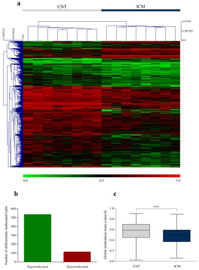 We analyzed global DNA methylation levels in ICM patients and CNT individuals. The β value and the p value were calculated for each detected CpG site, allowing the identification of 643 differentially methylated CpGs sites. We represented each CpG with a statistically significant value using a heat map (Figure 3a), which identified the ICM and CNT groups in two different methylation patterns. Specifically, the 82.9% of the CpGs sites were hypomethylated in ICM patients (Figure 3b). Furthermore, we analyzed the global methylation mean between both groups (ICM, mean β value = 0.481 ± 0.164 and CNT, mean β value = 0.569 ± 0.171; p < 0.0001 (Figure 3c)). These results showed genome-wide hypomethylation in ICM patients.