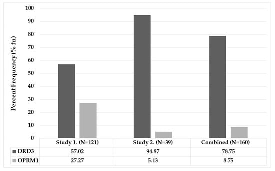 Utilizing the entire GARS panel, the subjects were subsequently genotyped according to previously published methods [,]. The frequency and percent of total calls (rank ordered) for the DRD3 (rs6280) risk alleles (Figure 2) were significantly higher (p < 0.05) at 57.02% (rank order 7) compared to the OPRM1 (rs1799971) at 27.27% (rank order 10).