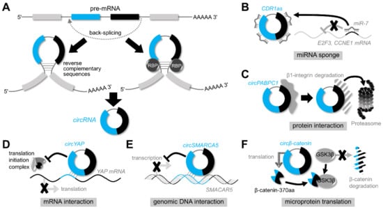 Through RNA sequencing and genomic annotation algorithms to extract “head-to-tail” spliced reads, thousands of circRNAs have been detected and identified in the human and murine transcriptomes over the last decade [14,15]. Indeed, an example is CDR1as, which functions as a microRNA (miRNA) sponge with its 74 seed matches against miR-7 [14,16]. Subsequent studies have revealed that circRNAs can function as regulators of alternative splicing and parental gene expression as well as miRNA sponges [17,18,19]. Through these diverse functions, circRNAs are involved in various physiological and pathological phenomena, which has made them the emerging focus of many research studies and fields, including cancer research.