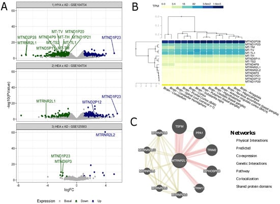 Analyses of the GEO and GTEx samples. (A) Volcano plot of DE analysis for Alzheimer’s disease; the marked dots are differentially expressed mitochondrial DNA genes, while all others are nuclear genes; (B) GTEx biclustering for mtDNA genes in 13 brain tissues; (C) gene–gene interaction network of MTRNR2L1.