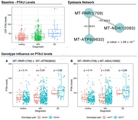 For PTAU levels, we identified a significant gene network between MT-RNR1(709) and two variants, namely MT-ATP6(9632) and MT-ND4(12083) (Figure 2); however, we did not find statistically significant differences between groups of genotype pairs when analyzing PTAU levels within each sample group (see Figure 2A,B).