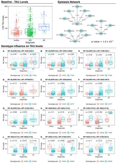 Interestingly, we found differences in the CSF levels for the three proteins and epistatic interactions between multiple mtDNA variants for PTAU and TAU. For PTAU, the variant is located in the 12S rRNA gene (MT-RNR1) and interacts with variants in Complex I (MT-ND4) and Complex V (MT-ATP6) genes; however, these interactions do not seem to affect PTAU levels in CSF.
