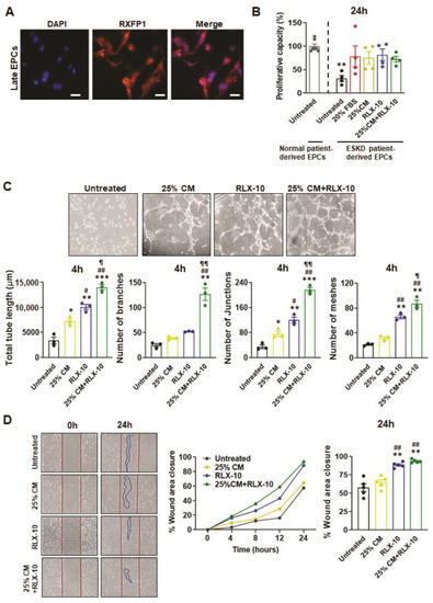 Comparatively, 20% fetal bovine serum (positive control) stimulated EPC proliferation (by ~60%) after 24 h (p < 0.001 vs. unstimulated cells; Figure 1B) but failed to stimulate EPC-induced capillary tube formation (Figure 1C). Based on these findings from healthy patient-derived EPCs, the effects of 25% BM-MSC-CM and/or 10 ng/mL RLX was then evaluated on ESKD patient-derived cells.