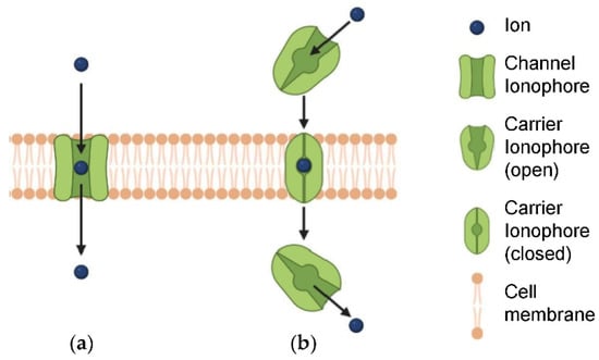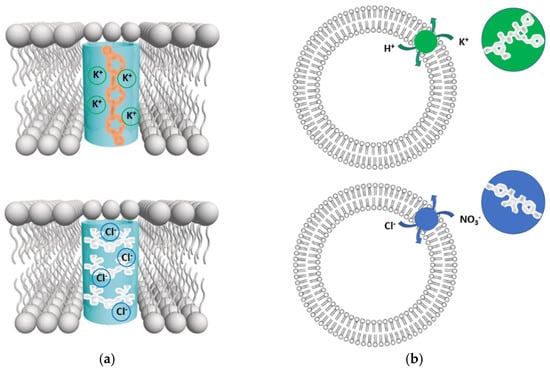 (a) Ion channels and (b) ion transporters. Reproduced with permission from []. Copyright Elsevier 2022.