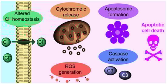 Talukdar’s research group has been very active on the development of artificial ion channels. Bis-diols were reported to self-assemble into amphipathic nanotubes via hydrogen bonds []. The diols were tethered at two alkyne ends of a central rigid 1,3-diethynylbenzene moiety and functionalized with dialkylamino groups with different lengths of the alkyl chain to modulate the lipophilicity of the systems. Among the members of the family, compound C1 (Table 2) had the optimal lipophilicity to allow its translocation across the phospholipid membrane of egg-yolk phosphatidylcholine large unilamellar vesicles. A detailed study allowed to define the selectivity towards Cl− over other anions, such as Br−, ClO4−, F−, NO3−, and I−, and the preferred transport mechanism as a Cl−/NO3− antiport. The Cl− transport ability across cell membranes was also successfully tested, by monitoring the dose-dependent fluorescent quenching of the cell-permeable Cl−-selective dye N-(ethoxycarbonylmethyl)-6-methoxyquinolinium bromide (MQAE) after incubation of HeLa cells with C1 for 24 h. The impact of Cl− transport mediated by C1 on cell viability was studied by MTT assay on different cell lines. The increased Cl− level inside the cells resulted in an increase in cell death. The disruption of Cl− homeostasis caused a change in the mitochondrial membrane potential that was accompanied by an increase in ROS production and release of cytochrome c. A detailed study of the cell death mechanism demonstrated that it was caspase-mediated (Figure 4).