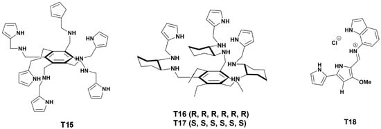 Quesada et al. used 6-indol-7-yl-decorated tambjamine-like compounds T15–T18 (Scheme 2) against Gram-positive and Gram-negative bacterial strains, as well as clinical isolates []. In particular, only T18 inhibited the growth of Gram-negatives, and it was also the most potent anionophore of the series, with good hemocompatibility.