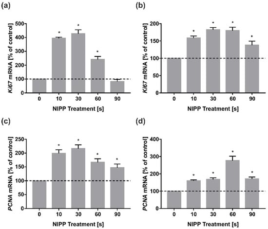 At first, we investigated the effect of NIPP on cellular growth. In HGF and HGK, treatment with NIPP caused an increase in Ki67 mRNA levels. In HGF, there was a dose-dependent increase of Ki67 mRNA for exposure times of 10 s to 30 s (Figure 1a). Longer treatment times resulted in a decrease in Ki67 mRNA regulation. In HGK, the dose-dependent mRNA upregulation was evident up to an application time of nearly 60 s (Figure 1b). The mRNA regulation of PCNA in HGF showed a similar pattern to Ki67 with a peak at 30 s (Figure 1c). Interestingly, in HGK, the PCNA expression maximum also occurred after 60 s of NIPP but was more pronounced than the Ki67 expression (Figure 1d).