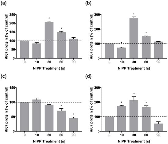 In contrast, in HGK, Ki67 protein levels decreased in a dose-dependent manner after 24 h of incubation, indicating anti-proliferative effects of NIPP (Figure 2c). Interestingly, Ki67 protein expression after 48 h correlated with mRNA data from the 24 h incubation (Figure 1b), demonstrating a dose-dependent stimulatory effect with a maximum at 30 s NIPP treatment (Figure 2d). Similar to the 24 h incubation data in HGK, 90 s NIPP led to a strong reduction of Ki67 protein levels by almost 50% at 48 h (Figure 2d).