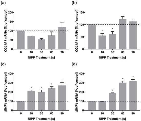 Impact of NIPP on COL1A1 and MMP1 mRNA levels in HGF and HGK at 24 h. Treatment was performed for the indicated times: (a) COL1A1 mRNA in HGF; (b) COL1A1 mRNA in HGK; (c) MMP1 mRNA in HGF; (d) MMP1 mRNA in HGK. n = 9. * statistical significance compared to control (0 s) (p < 0.05).