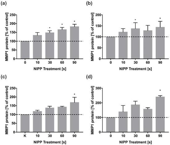 In HGF, the dose-dependent effect of the NIPP application time was already apparent after 24 h (Figure 4a) and was also still visible after two days, with a peak at 90 s of NIPP (Figure 4b). HGK showed a similar pattern, with 90 s NIPP also having the strongest effect on MMP1 protein levels at one and two days (Figure 4c,d).