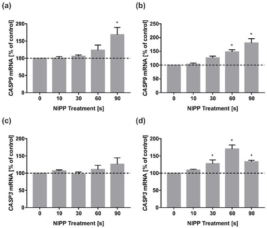 Finally, we investigated the influence of NIPP on apoptotic genes, as NIPP is also known for its apoptotic effect in cancer cells. It was shown for application times of 90 s NIPP in HGF and 60 s NIPP, as well as 90 s NIPP in HGK, that there was an upregulation in the mRNA expression of CASP9 (Figure 5a,b). Interestingly, this effect could not be detected with HGF in the mRNA expression of CASP3, which is regulating the end of the apoptotic cascade (Figure 5c). In comparison, CASP3 mRNA was upregulated in HGK at application times of 60 s. Interestingly, the effect of 90 s NIPP was significantly lower on CASP3 expression (Figure 5d).