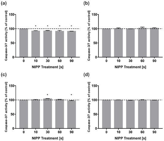 Effects of NIPP on Caspase-3/7 activity in HGF and HGK 24 h and 48 h after treatment, respectively. Data was normalised to control. Treatment was performed for the indicated times: (a) Caspase-3/7 activity in HGF at 24 h; (b) Caspase-3/7 activity in HGF at 48 h; (c) Caspase-3/7 activity in HGK at 24 h; (d) Caspase-3/7 activity in HGK at 48 h. n = 6. * statistical significance compared to control (0 s) (p < 0.05).