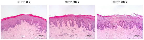 Effects of NIPP on gingival tissue biopsies at 24 h after NIPP treatment for 30 s and 60 s, as compared to the untreated group (NIPP 0 s). Hematoxylin and eosin (HE) staining, original magnification 10×. The scale bar represents 250 µm.