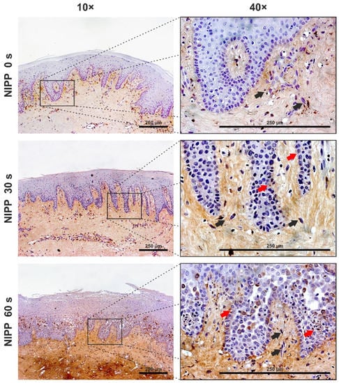 Influence of NIPP on gingival tissue biopsies at 24 h after NIPP treatment for 30 s and 60 s, as compared to the untreated group (NIPP 0 s). MMP1 staining, original magnification 10× and 40×. Red arrows: positively stained HGK, black arrows: positively stained HGF. The scale bar represents 250 µm.