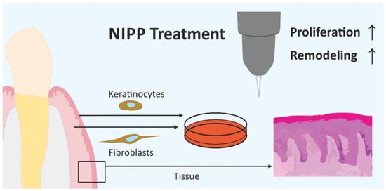However, this study has some limitations: For protein analysis, we focused only on the selected markers Ki67 and MMP1. Since PCNA mRNA was also strongly regulated by NIPP, the analysis of protein levels after NIPP treatment would also have been useful. However, we followed the publication of Bologna-Molina et al., who identified both markers as similar proliferation markers, but gave Ki67 a higher specificity regarding ameloblastic cells []. Further studies comparing Ki67 and PCNA directly in HGF and HGK could be interesting to further decipher the NIPP effect on cell proliferation in gingival cells. Additionally, we used tissue biopsies to study NIPP effects. Since this tissue is only nourished by the cell culture medium, only marginal conclusions can be drawn about the biological effect within a living organism. This had an impact on the Ki67 staining, as the cells in the tissue were constantly proliferating due to storage in medium, requiring us to adjust the antibody dilution to visualise differences between the groups. For this reason, fibroblast staining within the tissue is low. However, the penetration depth of NIPP has already been demonstrated in the literature []. Additionally, we studied tissue biopsies at one day because of the risk of tissue degradation in the humified incubator, regarding a longer treatment time. For this reason, further in vivo experiments with a focus on intraoral wound healing are necessary to further understand the effect of NIPP. However, the aim of the present study was to use human samples, which is more representative of the patients who will be treated with NIPP. Furthermore, it must be borne in mind that commercially available cells were used for the monolayer experiments. Although we were able to confirm cell culture results in the tissue model with regard to MMP1 and Ki67, primary HGF and primary HGK may show different results of gene and protein expression. Further studies should therefore investigate this point in more detail.
