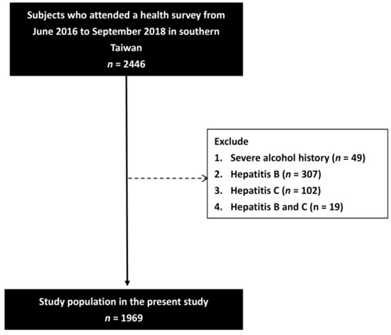 The participants were recruited from a health survey which was promoted through advertisements. They all underwent physical examinations, and an experienced physician recorded their clinical histories. Systolic blood pressure (SBP) and diastolic blood pressure (DBP) were also measured. All of the participants also underwent a face-to-face interview with a researcher, during which they completed a questionnaire asking about alcohol history. For men, heavy drinking is typically defined as consuming 15 drinks or more per week in his lifetime. For women, heavy drinking is typically defined as consuming 8 drinks or more per week in her lifetime. Participants who did not meet the above criteria and were not social drinkers were defined as having an alcohol history. Heavy alcohol users and those with a history of hepatitis B or C were excluded. In addition, hemochromatosis, Wilson disease, and autoimmune hepatic disorders were excluded. A total of 2446 participants with complete data were screened, of whom 477 were excluded due to a history of severe alcohol consumption (n = 49), hepatitis B (n = 307), hepatitis C (n = 102), and hepatitis B and C (n = 19). The remaining 1969 participants were analyzed (Figure 1).