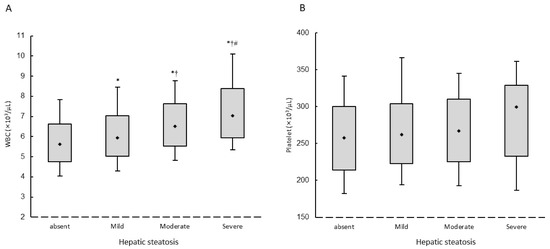 The relationship between the counts of white blood cell and the severity of hepatic steatosis (A), and the relationship between the counts of platelets and the severity of hepatic steatosis (B). Abbreviations: WBC, white blood cell. * p < 0.05 compared with non-hepatic steatosis; † p < 0.05 compared with mild hepatic steatosis; # p < 0.05 compared with moderate hepatic steatosis.