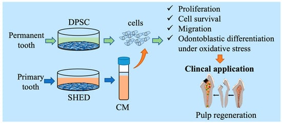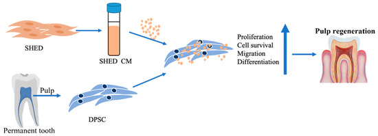 Graphic abstract. SHED were collected from the pulp tissue of primary teeth, and DPSC were collected from the pulp tissue of permanent teeth. The cytokines/growth factors contained in SHED-cultured conditioned media promoted DPSC proliferation, survival, migration, and cell differentiation in pulp regenerative therapy.