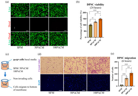 To compare the effects of CM and SFM on cell proliferation, CCK-8 assays were performed at different time points and after 24 h and 48 h of treatment. As shown in Figure 2a,b and Supplementary Figure S3 SHED CM significantly promoted the proliferation of DPSCs, and this effect strengthened with increasing CM concentrations (p < 0.0001). More significant growth promotion was observed in 100% SHED CM-treated cultures, with promotion up by 50% (149.3 ± 15.27) and 30% in 50% CM (124.4 ± 5.64) compared to that of SFM after 24 h. This effect continued after 48 h of incubation, by a significant of 61.73 ± 8.58 and 35.47 ± 8.58% in whole and 50% SHED CM, respectively. The live and dead assay showed consistently with CCK-8 assay result, the highest level of cell proliferation in 100% CM, followed by 50% CM, and lowest in SFM.