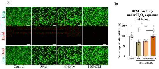 Treatment with SHED CM improved the viability of DPSC after H2O2 exposure. DPSCs were cultured with 200 µM H2O2 for 12 h before shifting to 100% CM, 50% CM and SFM for another 12 h. (a) Representative live and dead images of DPSCs confirmed the antioxidative stress effect of SHED-CM. (b) Cell viability was determined by CCK-8 analysis. All data are represented as the mean ± SD. The statistical significance was calculated using one-way analysis of variance (ANOVA) to compare groups. Represents ** p < 0.01, *** p < 0.001, ns = not significant, scale bar = 200 µm.
