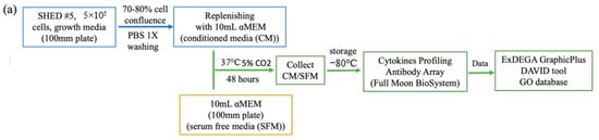 To identify factors responsible for the therapeutic effects of SHED CM, the cytokines and related biomarkers were profiled. SHED CM or SFM was collected by the described method and stored at −80 °C to maintain the biological properties before cytokine antibody analysis. The Fullmoonbio Cytokine Profiling antibody array (cat. SCK100/SEV07-SCK10, Full Moon BioSystems, Sunnyvale, CA, USA) contains two identical array slides featuring 310 antibodies for profiling cytokines, and related biomarkers human cells, tissues, serum, or culture media were used. The cytokines with fold changes > 1 (p < 0.05) were used for integrative analyses, and data were analyzed using ExDEGA v.3.2.1 software (eBiogen, Seoul, Korea). Figure 4a briefly describes the process of cytokine analysis from cell culture to the detection of cytokines and growth factors contained in SHED CM and SFM.