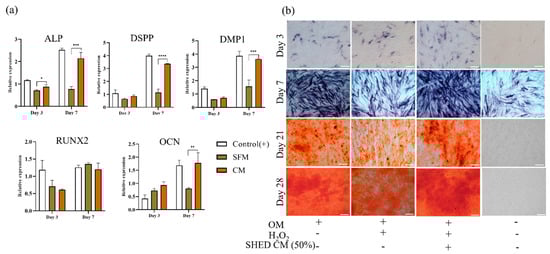 After 24 h of exposure to 25 μm H2O2, DPSCs were cultured in basal media diluted in CM and SFM at a 1:1 ratio and supplemented with an osteogenic inducer for 28 days. All groups (control, CM, and SFM) showed mineralized tissue differentiation capacity through the gene expression of odontoblast and osteoblast markers, ALP activity (ALP staining), and mineral deposition (ARS).