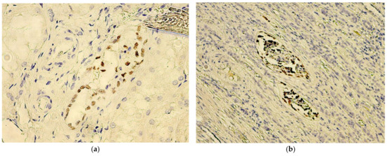 Another encountered particularity, referring strictly to intratumoral endothelial cells, is the fact that, in 3 of the 56 cases analyzed, these cells manifested positive WT1 nuclear staining, while tumor cell immunoreactivity for WT1 was negative for all of the three cases. Two cases showed mid-size arterial structures, demonstrating a majority of positive endothelial cells (Figure 2C), while, in the third case, a large vein manifested scarce positive endothelial cells, with a single adjacent positive tumor cell (Figure 2D)—the case was not considered to be a WT1 positive tumor, seeing as it did not meet the minimum set of quantitative analysis criteria described in Table 2.