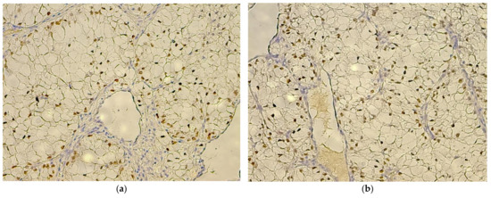 The normal renal tissue adjacent to the tumor constantly manifested for all of the evaluated cases, nuclear WT1 staining of podocytes and, also, of the epithelial cells, constituting the parietal layer of Bowman’s capsule (Figure 2A). The final reaction product steadily displayed an intense brown coloring for the aforementioned positive internal control, while all of the components of the cortical tubular system were negative, with the exception of occasional (only two cases, with negative tumor tissue WT1 staining) low-to-moderate intensity nuclear staining of connecting tubule cells (Figure 3a). It is worth mentioning that the podocytes maintained intense immunoreactivity, even in the case of renal corpuscles, which otherwise showed obvious morphological signs of degeneration (Figure 3b), being, apparently, the most resilient cell line involved in the renal blood-filtration barrier.