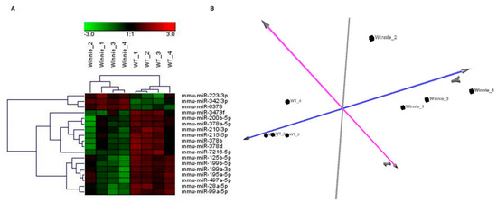 Figure 1. miRNA expression profile of colonic epithelial cells from Winnie and wild-type mice. (A) Hierarchical clustering using the 18 differentially expressed miRNAs (FDR < 0.05 and fold change threshold >2) discriminating colonic epithelial cells from Winnie mice compared to wild-type mice. Two principal clusters were identified on the basis of differential miRNA expression. (B) PCA based on the expression of differentially expressed miRNA in all samples. PCA showed evident clustering and confirmed the separation of Winnie and wild-type mice.