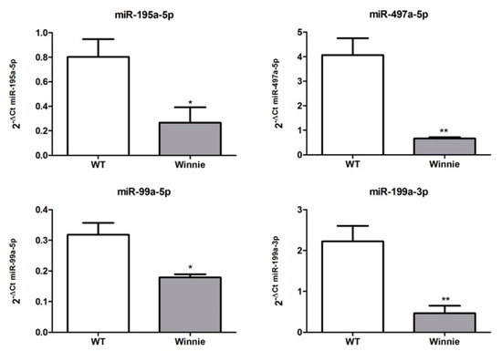 To validate the microarray results, we performed quantitative real-time PCR for miR-195a-5p, miR-497a-5p, miR-99a-5p, and miR-199a-3p on miRNAs isolated from colonic IECs. All tested miRNAs showed a significantly changed expression in Winnie mice compared to wild-type mice, confirming the microarray data (Figure 2).