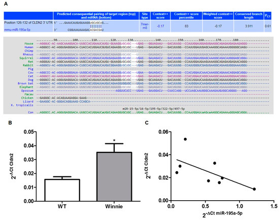 Figure 3. miR-195a-5p targets CLDN2. (A) Sequence alignment of the miR-195a-5p base-pairing sites in the 3’-UTR of Cldn2 mRNA showing that the regions complementary to miR-195a-5p are highly conserved among mouse, human, and chimp. The “seed” sequences of miR-195a-5p complementary to Cldn2 are shown in white. (B) Cldn2 mRNA expression levels evaluated in the same set of RNA samples used in the microarray validation. Cldn2 levels were significantly higher in Winnie mice compared to wild-type mice. Cldn2 expression levels were normalized on the housekeeping gene Gapdh. The histograms represent the mean ± SEM. * p = 0.03. (C) Linear correlation between the expression of Cldn2 and the expression of miR-195a-5p. Cldn2 mRNA levels inversely correlated with miR-195a-5p expression levels. Black points represent correlation between mRNA and miRNA expression for each sample (r = −0.64; p = 0.04).