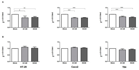 Figure 4. miR-195-5p regulates Cldn2 mRNA expression. (A) Cldn2 mRNA expression was analyzed by Real-Time PCR after transfection with miR-195-5p mimic in HT-29, Caco2, and T84 human cell lines. The increased intracellular amount of miR-195-5p (at 30 nM and 50 nM concentrations) led to a significant decrease of Cldn2 in all cell lines. (B) Cldn1 mRNA expression was analyzed by Real-Time PCR after transfection with miR-195-5p mimic in HT-29, Caco2, and T84 human cell lines. The levels of Cldn1 remained similar to mock-control in all cell lines. Expression data were normalized to the housekeeping gene Gapdh. Data are representative of four independent experiments (mean ± SEM). * p < 0.01, ** p < 0.001, *** p < 0.0001.