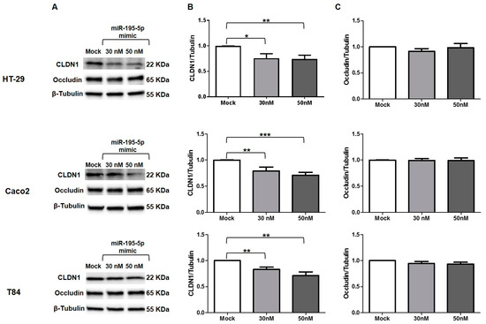 Figure 6. CLDN1 and Occludin protein expression after miR-195-5p mimic transfection. (A) Representative blots of CLDN1 and occludin protein expression in three IECs cell lines, HT-29, Caco2, and T84 after transfection. Western blot quantitative analysis demonstrated inhibition of CLDN1 (B) but not occludin (C) in all cell lines, after miR-195-5p mimic transfection at 30 and 50 nM. Mock represents cells which have undergone transfection without miRNA mimic. Raw data of the independent experiments of Western blot were reported in Appendix A. Data were obtained by dividing the normalized transfected sample values to normalized mock-control sample values. β-Tubulin was used as housekeeping protein to normalize the data. Data are representative of four independent experiments. The histograms correspond to mean ± SEM. * p < 0.05; ** p < 0.01, *** p < 0.001.