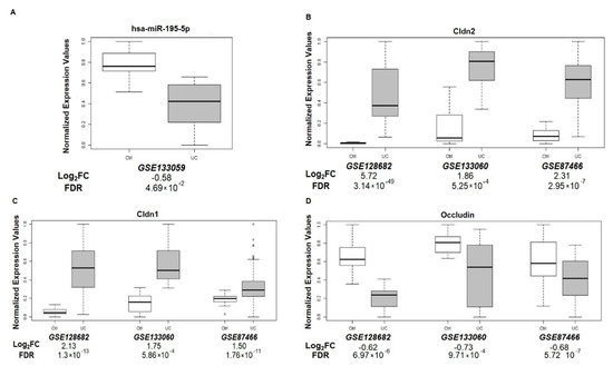 Figure 7. miR-195-5p, Cldn2, Cldn1, and Occludin expression in UC patients. Analysis of colonic tissue from UC and controls downloaded from the GEO database (GSE133059, GSE133060, GSE128682, and GSE87466). Mean expression data of miR-195-5p (A), Cldn2 (B), Cldn1 (C), and Occludin (D) were expressed as normalized expression values. LogFC value and FDR were reported for each dataset and each signal.