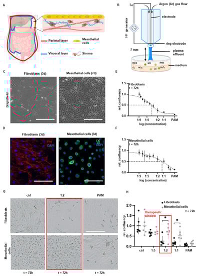 Postoperative intra-abdominal adhesions severely influence daily life and surgical outcome by interfering with the mobility of the abdominal organs. Peritoneal mesothelial cells and fibroblasts play important and complex roles in wound healing and adhesiogenesis. RONS were reported to be the main effective compounds of PAM which are formed by plasma irradiation at the interface between plasma discharge and the surrounding gas and liquid phases (Figure 1B). In order to analyze cell-specific anti-adhesive PAM effects, we used human peritoneal mesothelial cells and fibroblasts isolated from peritoneal wash cytologies and peritoneal tissue samples as previously described by our group (Figure 1C,D) []. Using this patient-specific 2D in vitro model, we demonstrated cell type-specific and dose-defined anti-proliferative efficacy of PAM. PAM-treated fibroblasts exhibited a significantly enhanced decrease in relative cell confluency compared to mesothelial cells (Figure 1E,F). The PAM dilution 1:2 was able to selectively target the pro-adhesive fibroblasts, whereas the proliferation of mesothelial cells was preserved (Figure 1G,H). In conclusion, we assumed the feasibility to selectively inhibit the pro-adhesive cell pattern of fibroblasts while maintaining the wound closure ability of mesothelial cells.