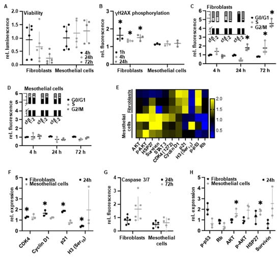 We next investigated the molecular cell response of mesothelial cells and fibroblasts in terms of cell viability, induction of DNA damage as well as cell cycle and apoptosis regulation. For this, both peritoneal cell types were treated with the cell type-selective PAM dosage 1:2. By measuring intracellular adenosine triphosphate (ATP), we found that PAM treatment significantly decreased cell viability in fibroblasts while that of mesothelial cells was not affected (Figure 3A). Because of the reactive properties of RONS which frequently interact with nucleic acids, the induction of complex cellular recognition and repair mechanisms for DNA damage has been frequently described after direct plasma treatment []. To semi-quantify DNA damage following PAM treatment, we used cytometry analysis after cellular staining with specific antibodies against phosphorylated histone H2AX at Ser139, which is a commonly used biomarker for DNA double-strand breaks. Only in fibroblasts, PAM treatment was followed by a statistically significant rapid and persistent H2AX phosphorylation within 72 h (Figure 3B). Cell cycle analysis by propidium iodide staining and cytometry within 72 h revealed a significant increase in fibroblasts in the G2 phase (Figure 3C). Again, this effect could not be demonstrated in mesothelial cells (Figure 3D). DigiWest protein profiling of fibroblasts revealed a significant increase in cell cycle-regulating proteins such as cyclin-dependent kinase 4 (CDK4) and cyclin D1 as well as cyclin-dependent kinase inhibitor 1 (CDKN1A, p21) [], accompanied by a crucial decrease in the mitotic biomarker phospho-histone H3 (Ser10) [] (Figure 3E,F). As a result, we reasoned that a substantial subset of the fibroblast cell population was arrested in the G2 phase and did not enter mitosis []. Given that PAM induces DNA damage, followed by cell cycle arrest, we assumed that apoptotic pathways may occur as a physiological consequence and a known PAM effect []. Indeed, and only in fibroblasts, PAM treatment resulted in activation of the effector cysteine-dependent aspartate-specific proteases (caspases) casp3 and casp7, p53 phosphorylation and activation (pp53) as well as the suppression of the tumor suppressor retinoblastoma protein (Rb) (Figure 3G,H). In contrast, pivotal anti-apoptotic factors such as protein kinase B (AKT) and phosphorylated AKT (pAKT), heat shock protein 27 (HSP27) and BIRC5 (survivin) were induced in mesothelial cells (Figure 3H).