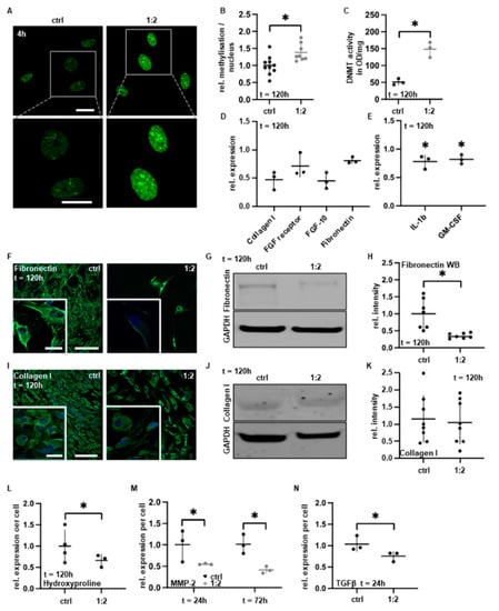 PAM treatment attenuates protein biosynthesis and the secretion of pro-adhesive factors. Fibroblasts were incubated with 1:2 diluted PAM for 4 h and analyzed after indicated timepoints. (A) Representative IF microscopy after staining with anti-5mC antibodies and (B) relative genomic methylation level per nucleus (number of foci normalized to the control); the scale bar equals 10 µm. (C) DNMT activity level per cell. (D) DigiWest protein profiles of pro-adhesive factors collagen I, FGF receptor and FGF-10 and fibronectin relative to controls. (E) Cytokine multiplex assay of GM-CSF and IL-1b in fibroblast supernatants relative to control. (F,G) Representative IF microscopy of fibronectin (F). Scale bars represent 100 and 10 µm, respectively. (G,H) Representative Western blot of fibronectin (G), and relative of fibronectin expression (H) (analyzed from (G)). (I,J) Representative IF microscopy of collagen I (I). Scale bars represent 100 and 10 µm, respectively. (J,K) Representative Western blot of collagen I (J), and relative collagen I expression (K) (analyzed from (J)). (L) Relative extracellular hydroxyproline expression. (M) Relative MMP-2 expression. (N) Relative expression of TGF β. Results are expressed as mean ± SD; * p < 0.05 as determined by paired t-test.