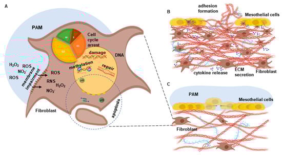 (A) Reactive species in PAM induce an intracellular increase in ROS and RNS, especially by cytoplasmic membrane impairment. This is followed by the induction of various intracellular response pathways such as altered genomic methylation patterns and signal transduction cascades involving attenuation of cell growth and protein biosynthesis by cell cycle arrest and p53-associated apoptosis. (B) Schematic model of pathological cell growth, cytokine secretion and secretion of pro-adhesive molecules such as collagen and fibronectin following peritoneal disruption of the superficial cell layer. (C) Hypothesized mode of action of PAM application including inhibition of fibroblast proliferation and attenuation of cytokine and ECM components secretion, and unhindered re-epithelialization by mesothelial cells.