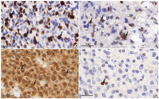 Immunohistochemical study of glial tumor markers. Magnification ×1000, Bar: 20 µm. (A) The level of nuclear non-histone protein—the marker of cell proliferation Ki-67 in the material of glioblastoma (grade IV). The diffusive pronounced nuclear brown staining (arrows) shows the binding reaction of antigen–antibody (up to 50% of cells in hot spots) which indicates a high proliferation index of Ki-67. (B) The presence of a p53 marker in the fragment of the anaplastic astrocytoma (grade III). Diffusive, moderately pronounced nuclear staining (arrows) shows the antigen–antibody binding reaction which indicates the presence of mutant protein p53. (C) The presence of an IDH1 mutation in the fragment of the diffusive astrocytoma (grade II). Diffusive, moderately pronounced brown staining in the cytoplasm shows the antigen–antibody binding reaction (arrows) which indicates the presence of an IDH1 mutation. (D) The presence of MGMT methylation in the material of the diffusive astrocytoma (grade II). Pinpoint (less than 10% of cells) nuclear brown staining (arrow) shows the antigen–antibody binding reaction which indicates the presence of methylation of the MGMT promoter.