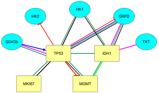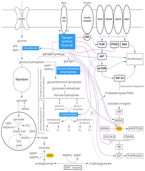 With the use of the databases on protein–protein interactions, the biologically significant interactions of IDH1 and p53 with glycogen synthase kinase 3β, hexokinase, glucose-6-phosphate dehydrogenase, transketolase are revealed.