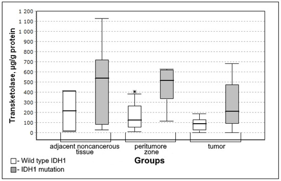 The level of transketolase in the peritumoral zone of the tumor was significantly higher for the IDH1 mutation group (U-criterion of Mann–Whitney p = 0.05; Kolmogorov–Smirnov criterion p = 0.1). This trend is observed both for adjacent noncancerous tissues and for tumor tissue, however, the difference between the Wild type IDH1 group is not significant.