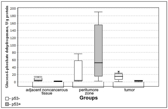 Glucose-6-phosphate dehydrogenase activity in the tumor was significantly lower in the group with the expression of the tumor suppressor protein p53 (U-criterion of Mann–Whitney p = 0.04; Kolmogorov–Smirnov criterion p = 0.02) compared to the group without p53 expression.