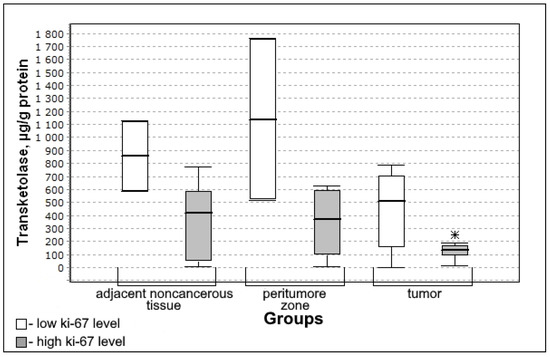 The content of transketolase was significantly lower in the group with high mitotic index Ki-67 (U-criterion of Mann–Whitney p = 0.04; Kolmogorov–Smirnov criterion p = 0.01) compared to the group with low mitotic index Ki-67. This trend is observed both for adjacent noncancerous tissues and for the tissue of the peritumoral zone of the tumor; however, the differences with the low mitotic index Ki-67 group are not significant.