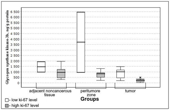 The content of glycogen synthase kinase 3β was significantly lower in the group with high mitotic index Ki-67 (U-criterion of Mann–Whitney p = 0.04; Kolmogorov–Smirnov criterion p = 0.02) compared to the group with low mitotic index Ki-67. This trend is observed both for adjacent noncancerous tissues and for the tissue of the peritumoral zone of the tumor; however, the differences with the low mitotic index Ki-67 group are not significant.