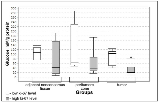 Glucose concentration was significantly lower in the group with high mitotic index Ki-67 (U-criterion of Mann–Whitney p = 0.006; Kolmogorov–Smirnov criterion p = 0.02) compared to the group with low mitotic index Ki-67. This trend is observed both for adjacent noncancerous tissues and for the tissue of the peritumoral zone of the tumor; however, the differences with the low mitotic index Ki-67 group are not significant.