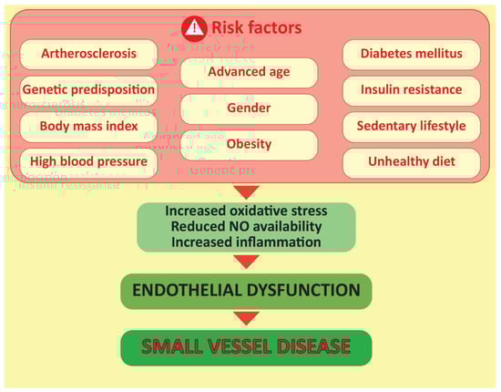Small-vessel disease (SVD) consists of multiple pathological processes that affect small arteries, arterioles, venules, and capillaries, and, therefore, influences the function of various organs such as the heart and brain [1]. Vascular risk factors such as age, gender, high blood pressure, body-mass index (BMI), diabetes mellitus, insulin resistance, obesity, a sedentary lifestyle, an unhealthy diet, and genetic predisposition to cardiovascular disease trigger various pathophysiological processes that lead to endothelial dysfunction, which underlies SVD (Figure 1) [2]. Impaired vasodilation of coronary microcirculation leads to inadequate blood flow and ischemia, which can occur independently of the presence of obstructive-coronary-artery disease (CAD). Unfortunately, not infrequently, SVD is associated with cardiovascular events and poor outcomes [2]. In the brain, there are many consequences of this silent killer, such as major vascular occlusion (stroke) and subcortical vascular dementia (sVAD) [2]. Worth mentioning here is that, pathophysiologically, the heart and the brain share some similarities, and the main one is that the vascular anatomy is quite similar, with arteries on the surface and penetrating arteries that provide tissue perfusion [3].