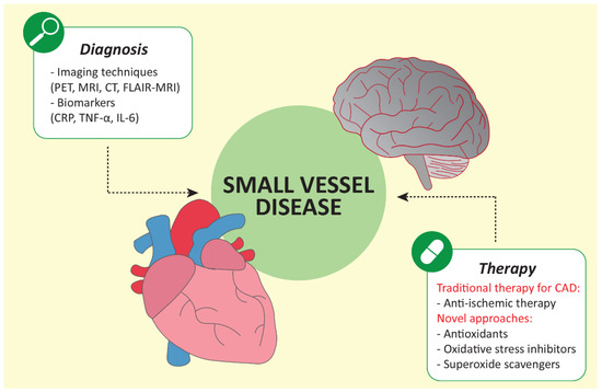 The figure describes diagnostic tools, both the imaging techniques and biomarkers for small-vessel disease, and the current therapeutic approach. CAD, coronary artery disease; CRP, C-reactive protein; CT, computed tomography; FLAIR-MRI, fluid-attenuated inversion recovery magnetic-resonance imaging; MRI, magnetic-resonance imaging; PET, positron-emission tomography; TNF-α, tumor-necrosis-factor α; IL-6, interleukin.